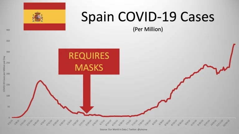 Spain wasn’t far behind France. They required masks when the case rate was close to zero, but again, within 5 months, despite high compliance with mask wearing, the case rate was about 1500% higher than when the mandate was initiated.